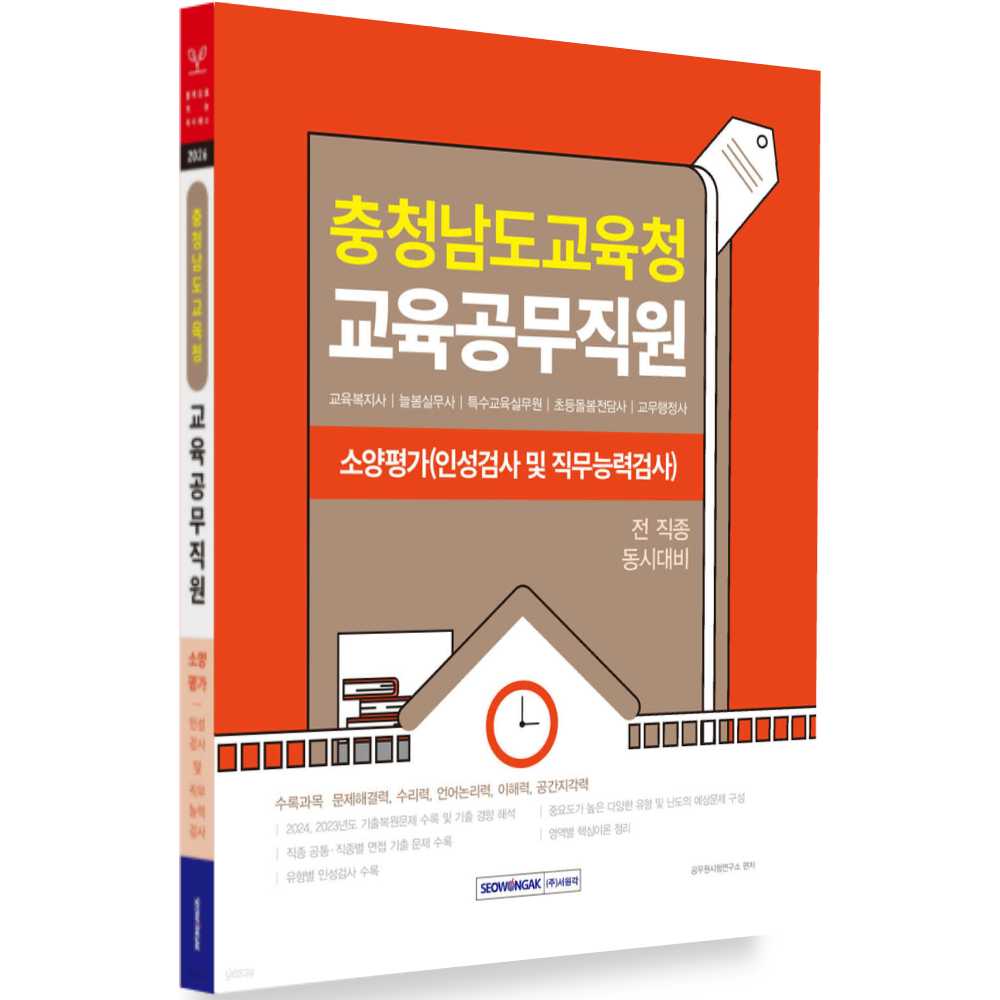 º»¼´Â ÃæÃ»³²µµ±³À°Ã» ±³À°°ø¹«Á÷¿øÀ» Èñ¸ÁÇÏ´Â ¼öÇè»ýµéÀ» À§ÇÑ ±âº»¼ÀÌ´Ù. Àμº°Ë»çÀÇ °³¿äºÎÅÍ ½ÇÁ¦ Àμº°Ë»çÀÇ À¯Çü, Á÷¹«´É·Â°Ë»ç Àü°ú¸ñ(¹®Á¦Çذá·Â, ¼ö¸®·Â, ¾ð¾î³í¸®·Â, ÀÌÇØ·Â, °ø°£Áö°¢·Â)ÀÇ ÁÖ¿ä ÇÙ½É ÀÌ·ÐÀ» Á¤¸®Çß´Ù. ¶ÇÇÑ Á߿䵵°¡ ³ôÀº ´Ù¾çÇÑ À¯ÇüÀÇ ¹®Á¦¸¦ ¾ö¼±Çϰí 2024³â, 2023³â ±âÃ⺹¿ø¹®Á¦µµ ¼ö·ÏÇÏ¿© ½ÇÀü ´ëºñ¿¡ ºÎÁ·ÇÔÀÌ ¾øµµ·Ï ÇÏ¿´´Ù.